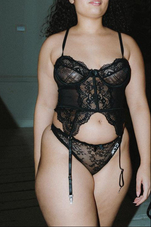 This black lace corset set cinches your silhouette in sultry, intricate romance, daring you to see your own irresistible beauty. Give yourself more romance with yourself and your partner. These are our happiest moments and we need more of them. It’s the pretty side of life! Designed to make you glow with love and confidence. Choose beauty, choose yourself!