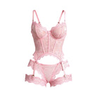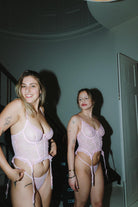 This pink lace corset set blooms across your silhouette in soft, blushing romance, inviting you to see your own beauty. Live with love. Give yourself more romance with yourself & your partner.